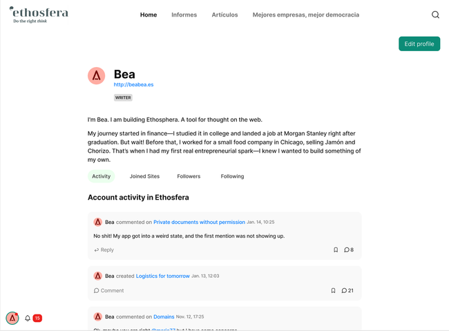 2.2. User sees member's detail with different areas: Bio, Activity,